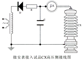 3、對氧化鋅、磁吹避雷器等被試品接地端可拆開的情況下,也可采用在被試品的底部(地電位側)串入電流表進行測量的方式。當要排除被試品表面泄漏電流的影響,可用軟的裸銅線在被試品地電位端繞上幾圈并與屏蔽線的屏蔽相聯接(見下圖)