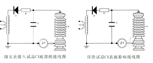 微安表必須有金屬屏蔽,應采用屏蔽與被試品聯接。高壓引線的屏蔽引出應與儀表端的屏蔽緊密聯接。如果被試品的表現污穢要排除被試品表面泄漏電流的影響可在被試品高電位端用裸體金屬軟線緊密繞幾圈后與高壓引線的屏蔽相聯接(見下圖)。