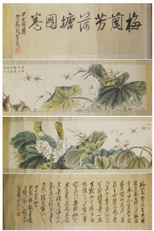 在馬維衡家中,他拿出了這幅珍貴的梅蘭芳手卷。展開一看,手卷長近4米,盡管年代久遠,但因主人保管得當,畫面上的顏色還是青翠欲滴。整幅畫卷看上去清新淡雅,荷花荷葉錯落有致。畫卷原本略長,但是在中間部位,點綴起幾只動態的蜻蜓,立刻就盤活了整幅畫卷,生機盎然起來。特別是梅蘭芳在綠色荷葉上的處理,更是濃淡皆宜,水墨洇染,顯示了深厚的中國水墨畫功底。在長卷的首尾處,都有當代書法大家徐利明所題字,他也盛贊這幅畫作“皆入專家法門,無稍遜也。”