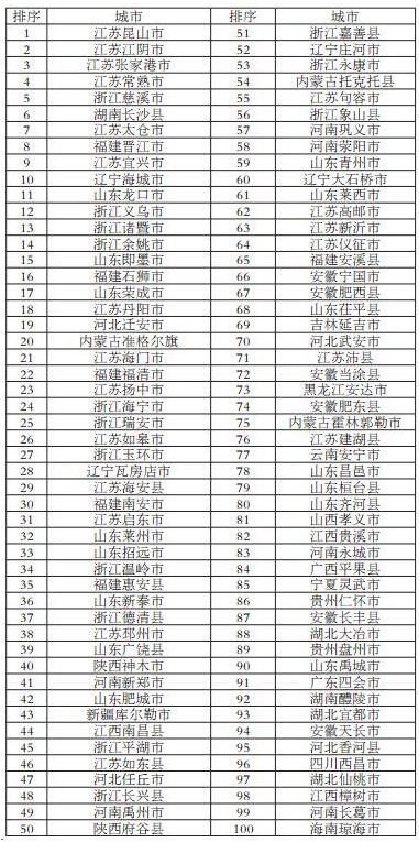 在外界一直較為關注的綜合實力百強縣市榜單中,江蘇、山東、浙江成為“百強縣”集中地,分別占有20席、15席、14席。全國前十強為:江蘇昆山市、江蘇江陰市、江蘇張家港市、江蘇常熟市、浙江慈溪市、湖南長沙縣、江蘇太倉市、福建晉江市、江蘇宜興市、遼寧海城市。