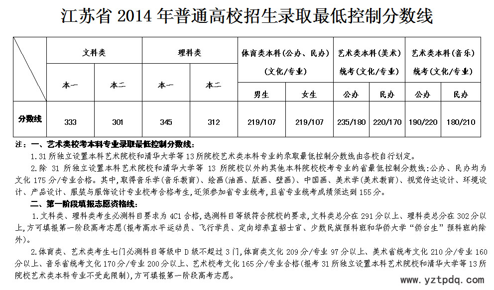 2014年6月24日下午,江蘇省高校招生委員會召開會議,審議通過了2014年江蘇省普通高校招生第一階段錄取各批次省最低控制分?jǐn)?shù)線。其中,文科:一本333、二本301;理科:一本345、二本312;藝術(shù)(文化/專業(yè))公本235/180、民本220/170; 體育(文/專)男219/107、女219/107。